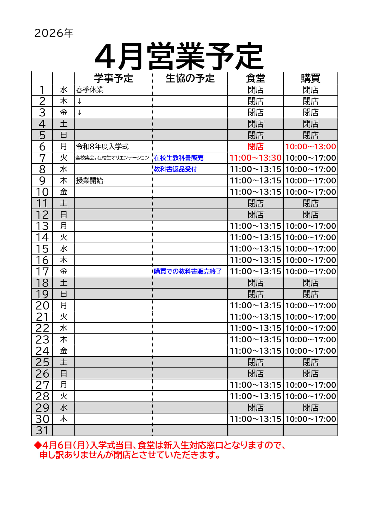 4月営業時間のお知らせ